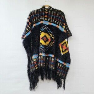 Free People Womens One Size Southwesten Bohemian Black Fringe Fuzzy Poncho