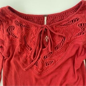 Free People Women's Red Orange Embroidered Ribbed Stretchy Long Sleeve MEDIUM