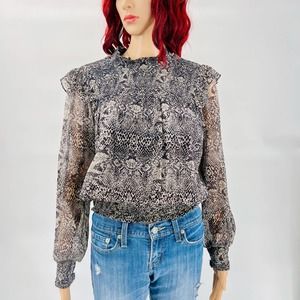 Free People Womens Roma Chiffon Top Medium Black Gray Snake Combo Ruffle Smocked