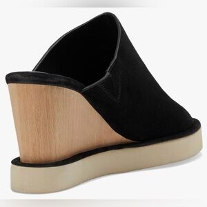 Sleek steps await with this pair of suede wedges, featuring a contrasting wood heel on a foam sole for tons of texture. Features: Slip-on style, backless design, suede fabrication, seamed details, wood wedge heel, foam outsole, round open toe, suede footbed Why We It: Perfect for elevated dressing across multiple seasons.NIB