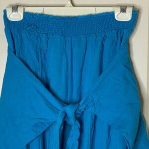 Free People women’s size small pants in a vibrant blue. These lightweight cotton-viscose blend pants feature a smocked elastic waistband, draped harem-style legs, and a unique front tie detail for a boho-inspired look. Perfect for casual wear, festivals, or resort vacations.