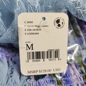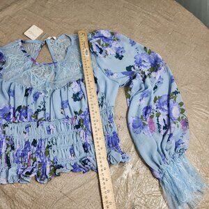 Free People Women's Size M Daphne Blouse Silver Blue Combo Smocked Cropped 37