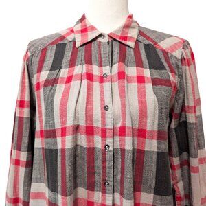 Good condition, minor signs of wear, no rips, holes or tears, nice red/gray/black plaid, button front, hi-low hem w/ruffle back, 100% cotton, oversized relaxed fit