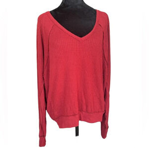 Free People Women’s Size Small Red Waffle Knit Slouchy Oversized V-Neck Top