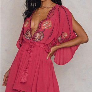 Free People Women's Small Cora Mini Dress Red Floral Embroidery Flutter Sleeve
