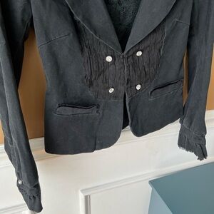 This elegant black jacket is perfect for any occasion. Its sleek design offers a sophisticated look. Ideal for pairing with both casual and formal outfits.