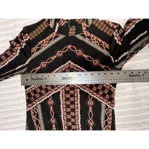 Get a perfectly groovy look with the Free People Stella Black Print Long Sleeve Mini Dress! Retro-inspired print stretch knit, in shades of brown and black, falls from a mock neck, into a seamed bodice and fitted long sleeves. Angular, empire waist tops a figure-skimming skirt with a mini hem. Exposed brass zipper at back with O-ring pull.