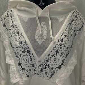 Features: Lace detailing, tunic length, pullover design, hooded neckline, relaxed fit, soft knit texture
