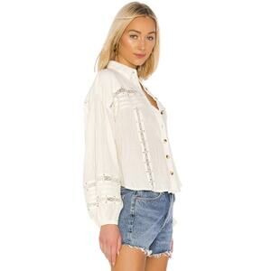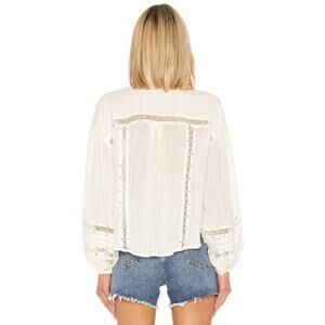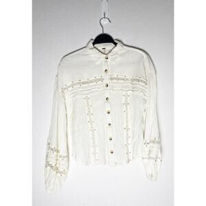 Free People Women's Summer Stars Button Down Frayed Gold Sequin Shirttail Ivory Cut Out Detailing Crinkle Gauzy Fabric Sheer Crochet Lace Trim Spread Collar Long Lantern Sleeves