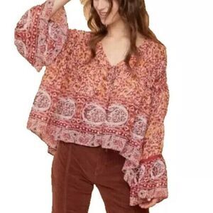 Free People Womens Sz Large Mustard Combo Floral Lorraine Tiered Kimono Top
