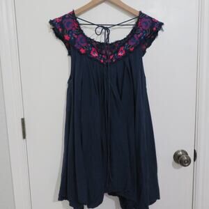 Free People Womens Sz XS Navy Blue Pink In The Flowers Embroidered Swing Dress