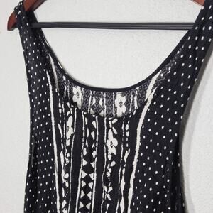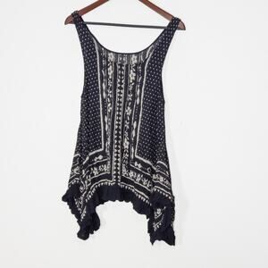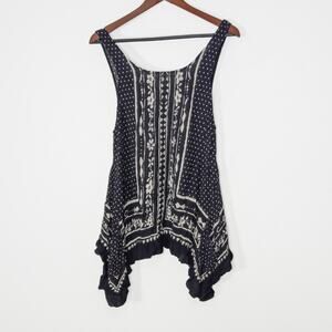 Free People sleeveless tank in a black and ivory tribal-inspired print with a raw handkerchief hem. Women’s size small. Lightweight rayon knit with soft stretch and a deep scoop neckline that layers easily over bralettes or swim tops. The hem floats uneven and low, adding that signature FP movement and a little edge. Pattern placement shifts around the body for an organic feel—every angle looks a little different.