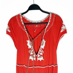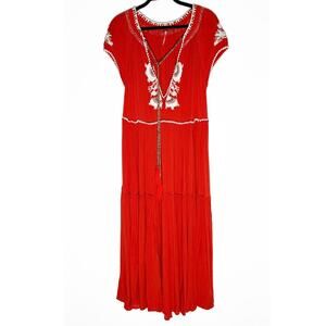 Free People Women's Ticket To Paradise Boho Peasant Maxi Dress Festival Concert Western Country Rodeo Gauzy Embroidered Tiered Raw Edges V Neck Tassel Tie
