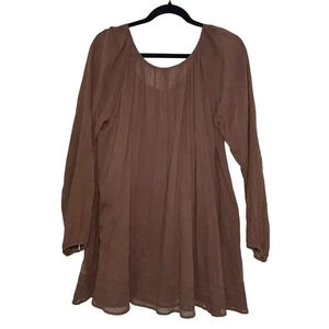 Free People tunic style top/ bathing suit cover up size medium. Lightweight and a deep brown, gauze like tunic. Light turquoise embroidery around the front collar. Each sleeve has a small button at the cuff. Round neckline with a vertical dip in the front with a tiny hook closure at the top. Retails for $108. Excellent condition! Measurements: length (from top of shoulder to bottom hem)- 31.5 inches, chest ( underarm to underarm)- 23 inches and sleeve length ( from shoulder seam to cuff)- 26.5 inches.