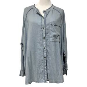 We The Free Women's Blue Button Down Fringe Trim Denim Top Blouse Size Large. Preowned. Great condition! Comes from smoke free home. Ships out fast!