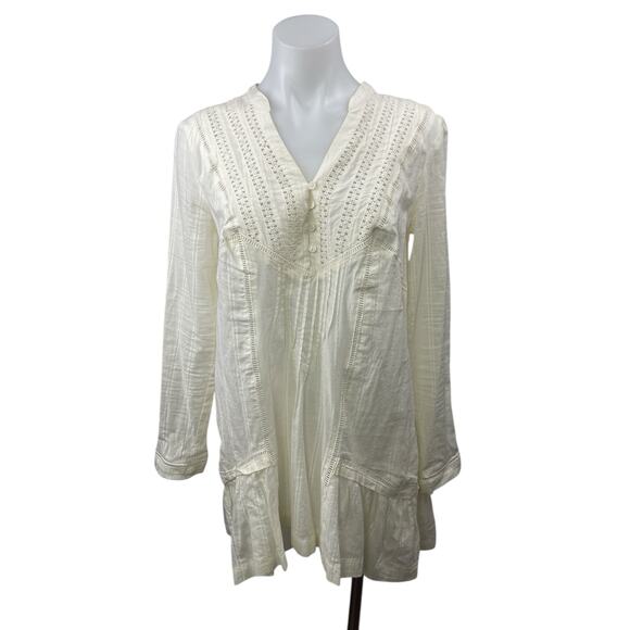 Free People Women's White Lace Pleated Long Sleeve Mini Tunic Shift Dress Sz XS