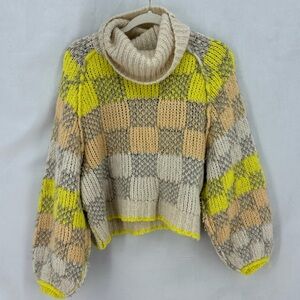 Free People Women’s XS Cream Yellow Neon Checkered Knit Sweater Cowl pullover