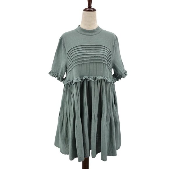 Relaxed fit short mini baby doll dress - shade of sage green. Made of a lightweight gauze fabric. Decorative ruffles on the front seam and ends of the sleeves. Pleated on the front & skirt portion. Two side pockets. Two buttons behind the neck that creates key hole down the upper back. 100% Cotton. Made in India.