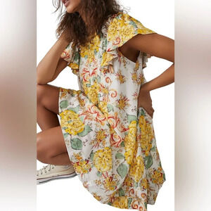 fun and femme in a classic floral print, this effortlessly essential mini dress is featured in a relaxed, shapeless fit with ruffled flutter sleeves for added dimension.