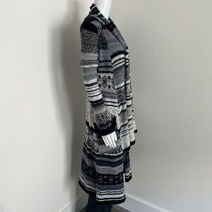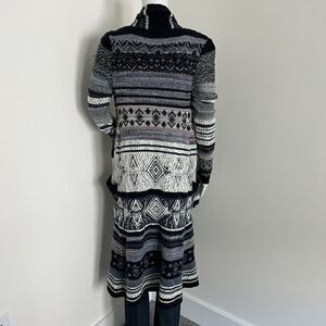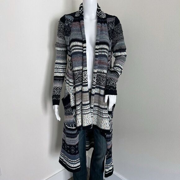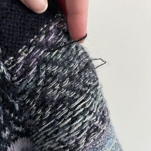 Blue multi-colored Fair Isle cardigan with stripes and pockets. The front is open and cascading. The material is an alpaca wool blend. I have repaired a hole on one of the sleeves and have pointed it out in the photos what it looks like sewn shut. There are two or three loose thread loops near the shoulder. There is also some slight texture on the knit in places. Please see pictures for details and material content.
