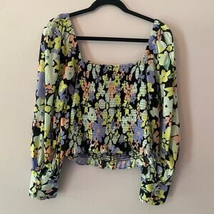 Free People Women's size Medium Colorful Floral Cotton Smocked Long Sleeve Blouse. Free People brand women's blouse top in a size medium. Black background with pink, purple, and blue florals. Fabric is 100% cotton. Smocked bodice with puff sleeves. Cuffs have buttons. Measurements as pictured. In great pre-owned condition, see photos for more details. Small tear in the armpit as shown. Always feel free to ask any questions you may have! Reasonable offers accepted.