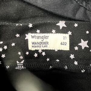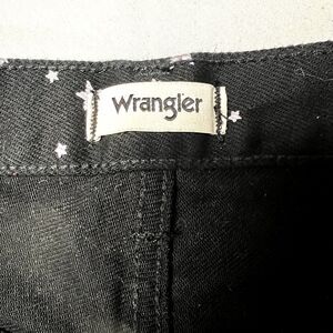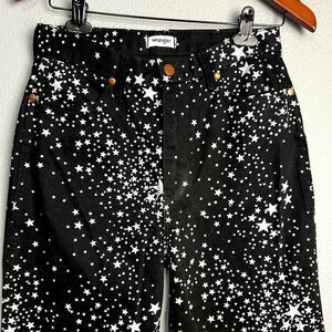 Keywords: Wrangler jeans, star print jeans, flare jeans, wide leg jeans, black jeans, western jeans, corduroy pocket jeans, celestial jeans, retro jeans, vintage style jeans, festival jeans, statement jeans, designer jeans, unique jeans, trendy jeans