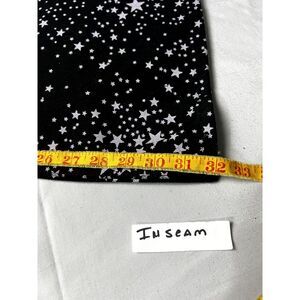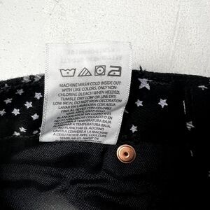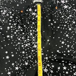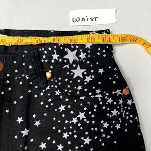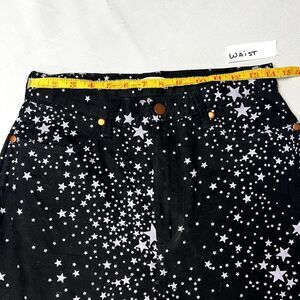 Eye-catching star print flare jeans, featuring a striking celestial design that's sure to turn heads. These jeans boast a classic five-pocket design, enhanced by unique corduroy back pockets that add a touch of texture and vintage flair. The black denim provides a versatile backdrop for the white star pattern, making them easy to pair with a variety of tops and shoes. Perfect for adding a playful twist to casual outings or making a statement at concerts and festivals.