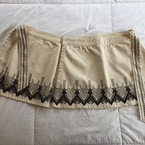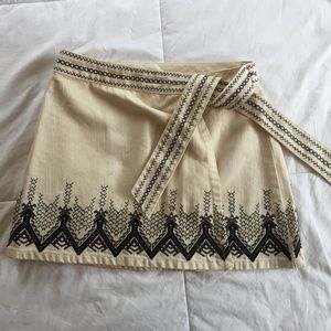 This bohemian style wrap around skirt is a must have! Off-white jean material with an interior button closure and outside tie closure. Beautiful embroidery detail on bottom that wraps around the garment. Side tie is cute and not bulky when worn. Like NEW! Make this your favorite skirt with boots this season!