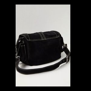 Features: Adjustable and removable shoulder strap, asymmetric top flap closure, lined interior, zip pocket inside, soft suede fabrication