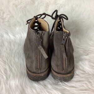 This is a pair of brown suede leather, moccasin toe, lace up, back zip . ankle boot booties from Free People x Faryl Robin. Some wear on foot beds and soles. Fall, winter, boho, bohemian, menswear vibes, combat.