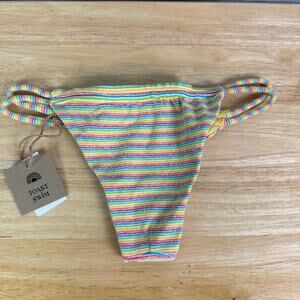 Vibrant striped bikini bottom with side ties. Features a mix of yellow, red, blue, and green stripes.
