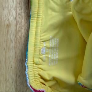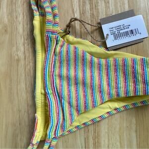 Vibrant striped bikini bottom with side ties. Features a mix of yellow, red, blue, and green stripes.