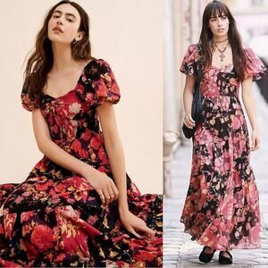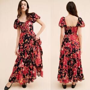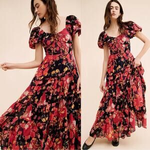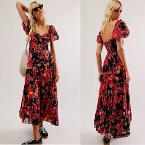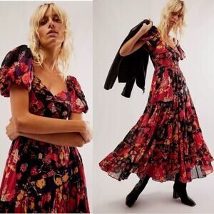 Free People XL Bohemian Gypsy Maxi Dress Red Black Floral Ruffles Dainty Fall