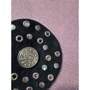 Features: Oversized silhouette, circular design, metal studs all over, designed to sit at the hips