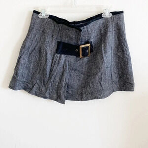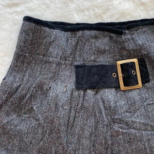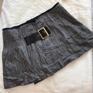 Step back into the early 2000’s with this skirt. Tweed knit material. Short mini skirt. Buckle detail on front. Has lining underneath. Side zip. Low waist. Made with wool blend. No flaws, in good preowned condition