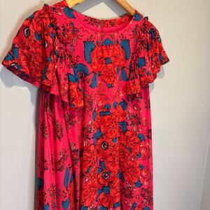 Butterfly sleeve. Exposed zip at the back of the neck. Floral print in pink, red, blue and purple. Lined.
