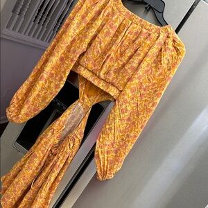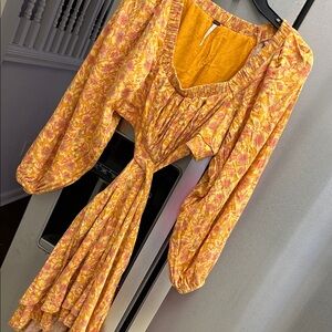 Chic floral blouse with a vibrant yellow and pink pattern. Perfect for casual outings.