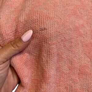 Free People You and I semi-sheer turtleneck top in baby pink with a Baroque style pattern. Rounded hem. Fitted. Polyester/cotton. Size small. Lots of stretch. Small hole at front. Please view photos.