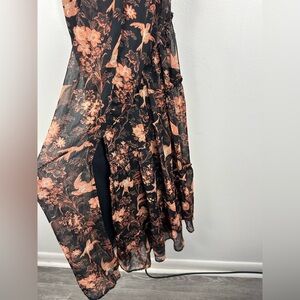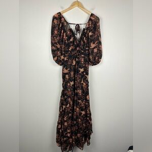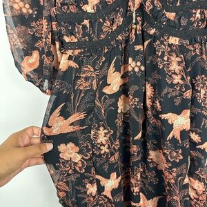 Free People You're A Jewel Maxi Dress Chiffon Black Rose Bird Print Floral Sz XS