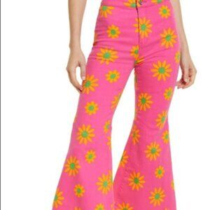 Free People Youthquake Printed Crop Flare Jeans in Lipstick Combo Pink -NWT