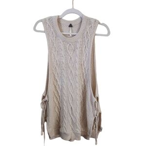 Free People Yuma Sweater New Romantics Ivory Cable Knit Open Sides, Size S. Pit to pit 22", shoulder to hem 31", Double Tie Sides, Crew Neck, Ribbed Hems, Neutral, Bohemian. Good Pre-Owned Condition