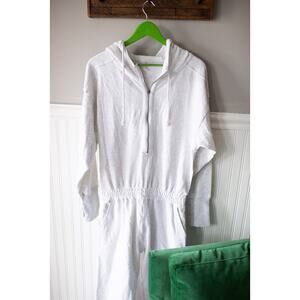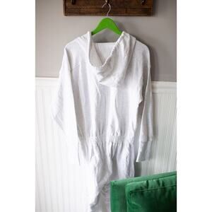 So comfy and perfect for lounging, this sweat-inspired onesie features a hooded design with a drawstring cinched waistband and slim-fitting silhouette.