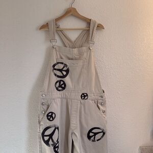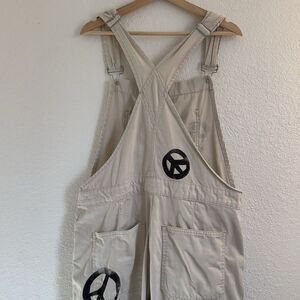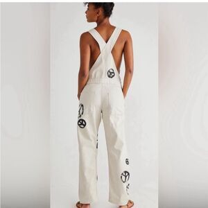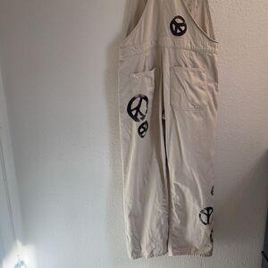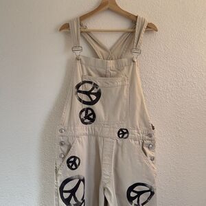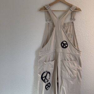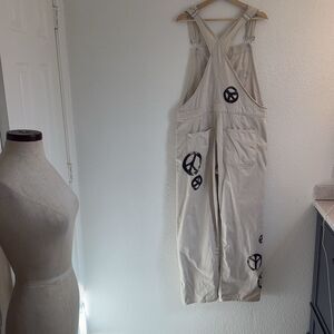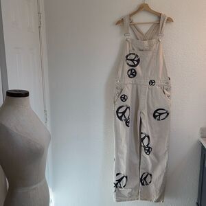 Ziggy overalls from Free People. Size Large. Cream color with black peace symbols. Rare find in excellent condition. I only wore these once and followed care instructions carefully.