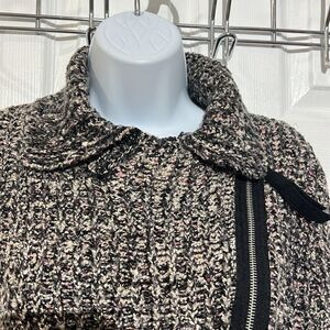 Multi color knit - black gray white with pink and orange throughout Black contrast zipper, pull and front pockets Fold down collar