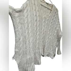 Free People asymmetrical bottom Cream Cable Knit Sweater. Size small. Vneck. Distressed bottom. Oversized.