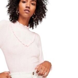 This Free People sweater in a soft ballet pink hue features a cozy cowl neck design, perfect for adding warmth and style to your wardrobe. Its ribbed lightweight fabrication fmake it an ideal choice for casual outings or lounging in comfort. Ruffle trim. The sweater's versatile color and chic design ensure it complements a variety of looks effortlessly. Euc