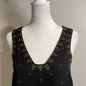Free People black mini gold beaded dress - 0 Beautiful staple dress for any closet Has sewn in copper / gold beading beads Mini dress Zip up back with secure clasp Wore on 1-2x There are a couple beads missing but with the thread being the same color, they were not noticeable until I was inspecting it to sell - all in photos Price is reflective For measurements see photos