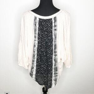 Free People black peach white floral batwing sleeve button down top. Pullover style with scoop neckline. Full button down front. Raw trim. Curved hemline. Midlength batwing sleeves. Oversized fit. Size Small. Excellent preowned condition. Minor wash wear. A couple of tiny spots on sleeve.