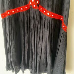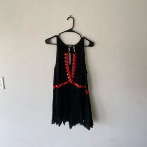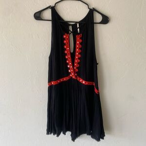 Free People black red trim sleeveless tunic romper playsuit jumper with mirror detail rare XS. Has small holes on back upper area photographed. Designed manufactured with raw gray hem. Boho bohemian resortwear indie