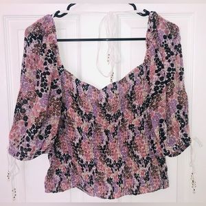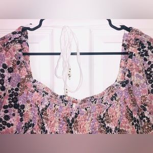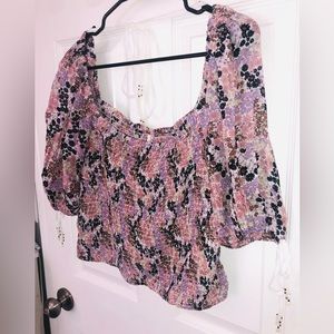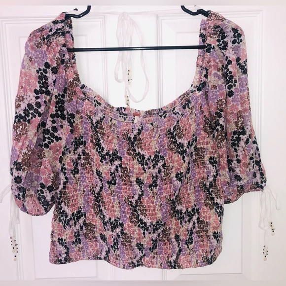 Floral “soft combo” Free People Smocked Puff sleeve crop top. Ties on bottoms of each puff sleeve and behind back have cute beads. Smocked body/stomach area is stretchy. Made of- Body: 100% Viscose. Smocking thread: 72% Polyester, 28% Elastane. Size large. Chest measures at 16.5 inches. New with tags!